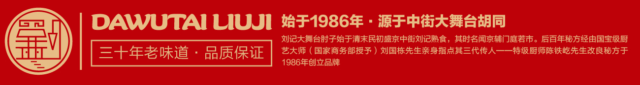 盛京,昔乃大清王朝發(fā)祥之地。劉記大舞臺肘子始于清末民初盛京中街劉記熟食,其時名聞京輔門庭若市。后百年秘方經(jīng)由國寶級廚藝大師(國家商務(wù)部授予)劉國棟先生親身指點其三代傳人——中國烹飪大師劉家驥之徒中國烹飪大師陳鐵屹先生改良秘方,于1986年創(chuàng)立品牌。劉記大舞臺經(jīng)營的產(chǎn)品涵蓋招牌熏肘,豬蹄,燒雞等系列,產(chǎn)品色澤潤嫩、酥美可口、吮指尤香、譽滿沈城,遂成古今絕味,其獨特的風(fēng)味深受沈城百姓喜愛。經(jīng)過三十余年的沉淀發(fā)展,劉記大舞臺品牌也成為了沈陽地標(biāo)美食文化名片之一。